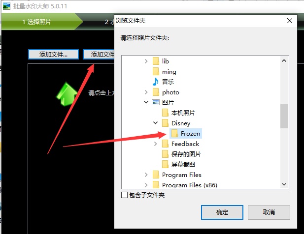 点击“添加文件夹”按钮,在弹出的窗口中进行浏览,选择要添加水印的照片所在的文件夹,可以一次添加该文件夹内的所有照片。支持包含子文件夹选项。