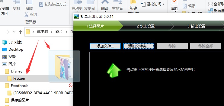 批量水印大师支持多种添加照片的方法,包括选择多张照片添加、选择照片所在的文件夹添加,还可以直接拖动要添加水印的照片到窗口中。